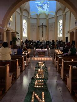 Mit einer sehr schönen Liedauswahl und adäquaten Texten haben die beiden Chöre und einige Frauen aus unserer Gruppe alle Anwesenden in einen nahezu vorpfingstlichen Zauber versetzt. Der Kirchenraum war entsprechend mit warmen Lichterquellen und Friedensbildern gestaltet.