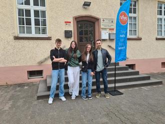 Das Bild zeigt v.l.n.r Justin Alt, Chiara Broy und Hannah Weigand vom Deutsch A-Kurs sowie Fachlehrer und Konrektor Benny Schmitz