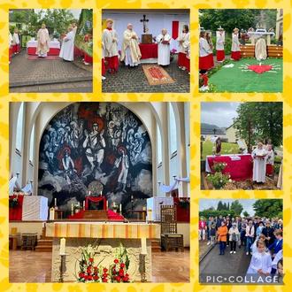 In diesem Jahr fand die gemeinsame Feier des Hochfestes Fronleichnam in unserer Pfarreiengemeinschaft am Donnerstag, dem 30.05.2024 in Wustweiler statt. Herr Pfarrer Schuligen und Frau Gemeindereferentin Bärbel Warken feierten mit vielen Gläubigen das Hochamt in der Kirche Herz Jesu.