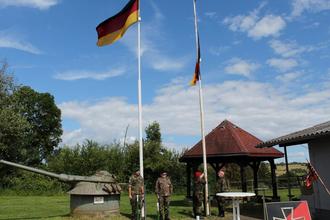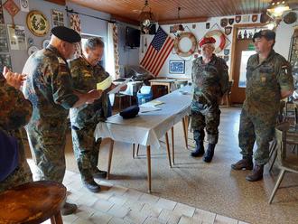 Die Feier war um 16:00 Uhr angesetzt. Peter Schumacher, der Vorsitzende der RK-Illtal e.V., konnte in seiner Eröffnungsrede einige Reservisten, Mandatsträger der Gemeinde Eppelborn, sowie Bürger begrüßen. Neben dem Landesvorstandsmitglied (Saarland) des Reservistenverbandes, Obermaat d.R. Olaf Sänger, waren der Ortsvorsteher Frank Klein, der Wehrführer der Feuerwehr der Gemeinde Eppelborn, Andreas Groß, sowie der Kulturvereinsvorsitzende Reimund Klein, gekommen, um der Zeremonie am 1. Veteranentag der RK-Illtal e.V. teilzunehmen. Eine besondere Begrüßung erging an das Ehrenmitglied Erwin Zimmer (85) und seine Ehefrau Elfriede. Erwin Zimmer war einer von drei ersten Bundeswehrangehörigen aus Dirmingen, die zum Wehrdienst eingezogen wurden. Er ist Gründungsmitglied der RK-Illtal e.V. und hat die Ehrenmitgliedschaft verdient erhalten. Nach der Begrüßung durch Peter Schumacher wurde in einer Zeremonie die Flagge der Bundesrepublik Deutschland gehisst. Peter Schumacher ging in seiner weiteren Rede auf den Veteranentag und die Geschichte der RK-Illtal e.V. ein. Danach gab er das Wort an Ortsvorsteher Frank Klein, der Worte des Dankes für die Arbeit der Reservisten innerhalb der Dorfgemeinschaft fand. Frank Klein überreichte noch eine Spende, um die Arbeit der Reservisten zu unterstützen und zu fördern. Nun übernahm der Wehrführer der Feuerwehr der Gemeinde Eppelborn, Andreas Groß, das Wort, der selbst acht Jahre in der Bundeswehr gedient hat und von seinen Erfahrungen, auch im Auslandseinsatz, berichtete. Andreas Groß begrüßte die Einführung des Veteranetages und dankte für die Einladung zur Feier.