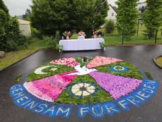 Auch in diesem Jahr gestaltete das Team der sozialen Betreuung unseres Seniorenheims St. Josef einen Blumenteppich anlässlich der alljährlichen Fronleichnams-Prozession in Eppelborn. Unser Motto dieses Jahr lautete: „Gemeinsam für den Frieden“, mit dem wir ein Zeichen des Miteinanders ausdrücken wollten. Gerade bei der aktuellen Weltlage lag uns diese Botschaft ganz besonders am Herzen.