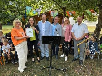 Am Dienstag, 04.07.2023 erhielten wir eine bundesweite Auszeichnung des Verbandes Deutscher Naturparke als „Naturpark – Kita“. In einer Naturpark – Kita werden Themen wie Natur und Landschaft, regionale Kultur und Handwerk, Land – und Forstwirtschaft regelmäßig im Alltag und auf Ausflügen behandelt. Bei authentischen, lebendigen und ganzheitlichen Naturerfahrungen werden neben Wissen über ökologische Zusammenhänge eine emotionale Bindung zur Natur hergestellt – die Voraussetzung für einen verantwortungsvollen Umgang mit den natürlichen, regionalen Lebensgrundlagen. Wir freuen uns sehr und sind auch stolz darauf, als einzige saarländische Kindertagesstätte nun den Titel „Naturpark-Kita“ tragen zu dürfen. Wir danken unseren Kooperationspartnern Herrn Rainer Ulrich, Herrn Werner Paul, Herrn Guido Geissen, sowie Frau Helga Schäfer, sowie den Mitarbeitern des Naturparks Saar-Hunsrück für die tolle Unterstützung. Bei der Feierstunde haben die Kinder mit ihren Beiträgen über unser aktuelles Thema „Hier bin ich zu Haus, auf meine Heimat pass ich auf“ die Gäste begeistert. Zu Beginn sangen sie unseren Pusteblumensong: „Pusteblume, Pusteblume, unsre Kinderzeit ist hier wie eine Pusteblume. Wir kommen hierher, wir blühen hier auf, bis uns der Wind verweht wie eine Pusteblume“. Die Kinder haben auch ihre Gedanken zu dem Thema vorgetragen. Zum Abschluss kam der absolute Höhepunkt: Wir konnten unseren eigenen Song „Heimat, das sind wir“ uraufführen. Der Song entstand aus den Gedanken der Kinder und aus der Feder der Band „Perlregen“. Vielen herzlichen Dank an Martina und Thomas. Voller Begeisterung sangen die Kinder „Langeweile wird´s bei uns niemals geben, als Naturparkforscher gibt es viel zu erleben“. Ein toller Moment! Wir sind stolz auf euch, liebe Kinder. Ihr habt alles so toll gemacht. Wir wollen auch weiterhin mit Freude, zusammen mit den Kindern unsere Welt erforschen und damit einen Teil dazu beitragen, den Kindern zu vermitteln, dass unsere schöne Welt bewahrt und geschützt werden muss. Das Erleben der Kinder hat dazu geführt, dass sie ihre Heimat kennen und schätzen gelernt haben. „Unsre Heimat, sie verdient ´nen Applaus, auf unsre Heimat passen wir immer gut auf…“, so konnten die Gäste von den Kindern hören. Somit leisten wir einen wichtigen Beitrag zur Bildung nachhaltiger Entwicklung.