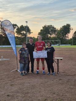 Übergabe des Preisgeldes für den ersten Platz des Gemeindepokals, gesponsert von der Levobank, an die FV Eppelborn durch Margit Drescher, Beigeordnete der Gemeinde Eppelborn und Vertreterin vom Bürgermeister Andreas Feld, und unsere Geschäftsführung Verena Gehres und Maurice Schulz