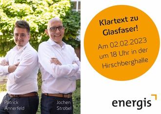 Endspurt! Die Nachfragebündelung für den Glasfaserausbau endet in rund 5 Wochen. Nur noch bis Ende Februar können wir gemeinsam das Ausbauziel für Bubach-Calmesweiler erreichen. Sie sind noch unentschlossen, was das Thema angeht? energis spricht Klartext: Patrick Annerfeld, Teamleiter des Außendienstes, und Jochen Strobel, Leiter Privat- und Gewerbekunden bei energis, stellen sich am 2. Februar in der Hirschberghalle in Bubach-Calmesweiler Ihren Fragen zum Glasfaserausbau - offen und ehrlich. Unser Ausbaupartner lädt Sie als Anwohnerinnen und Anwohner ein, bei Pizza und kühlen Getränken über die Zukunft Ihres Ortes zu diskutieren.
