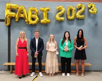 Jahrgangsbeste FOS-W 2023: stellv. Schulleiterin Kirsten Prams, Robin Schröck, Stefanie Garcia Becker, Emilia Groß und Emma Binger (v. l. n. r.).