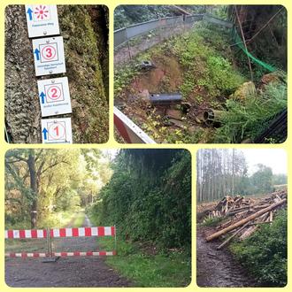 Die in Folge von Hitze und Trockenheit abgestorbenen Fichten fallen der Motorsäge zum Opfer, der von Sturzfluten aufgerissene Weg wird saniert.