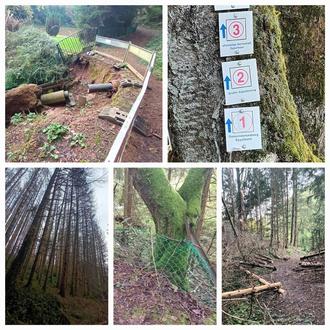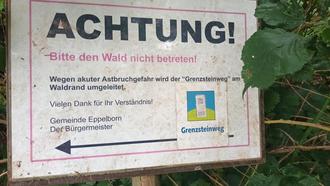 Die Hitzesommer der vergangenen Jahre zeigen Folgen auch an Buchen. Wipfeldürre erhöht die Astbruchgefahr schon bei leichten Winden. Der Grenzsteinweg ist daher schon seit längerer Zeit im Bereich des Kippwaldes in Eppelborn gesperrt. Abhilfe ist hier nur schwer bis unmöglich.