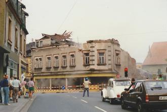 Daran anschließend hatte die levoBank das 1977 fertiggestellte Hauptgebäude nach Ankauf des nebenstehenden Gebäudes (Albayrak Kebap) deutlich erweitert. Etwa zeitgleich erfolgte die Fusion mit der Lebacher Volksbank. Auch das gegenüberliegende Baustofflager von Friedrich Schorr wurde erworben, abgerissen und ein Firmenparkplatz angelegt.1987 hatte die Gemeinde zudem die weitgehend verwahrloste Schmiede Grün an der Ecke Schlossstraße / Europaplatz gekauft, abgerissen und eine kleine Grünanlage angelegt.