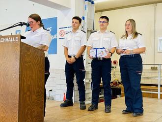 Mohammed Suliaman wurde als neues Mitglied in die Jugendfeuerwehr aufgenommen, Fabian Brill wurde zum Hauptfeuerwehrmann befördert. Alexander Glaub, Eva Maria Herrmann, Frank Jakob und Stefan Woll erhielten die Beförderung zum Hauptlöschmeister, Uwe Neu zum Brandmeister.