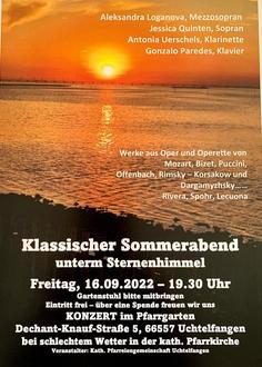 Nach dem Konzert freuen wir uns auf den Austausch mit ihnen bei Wein und Sekt. Bei schlechtem Wetter findet das Konzert in der kath. Pfarrkirche statt.