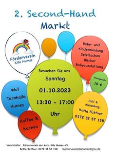Am Sonntag, den 01.10.2023 wird ein Second-Hand-Markt vom Förderverein der katholischen Kita Humes e.V. in der Sporthalle in Humes in der Zeit von 13.30 Uhr bis 17:00 Uhr stattfinden.
