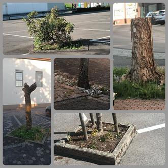 Schleichend schwinden die Bäume im Ort: Standort zu klein, fehlender Stammschutz, fehlende Bewässerungsdrainage, Wassermangel, Dürre, Stammverletzungen, Pilzbefall und dann tot und entfernen.