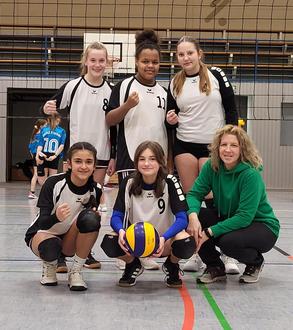 Mit dabei waren (stehend v.l.n.r.): Jolie Bauer, Tamia Kamu, Melanie Kunst, (kniend v.l.n.r.): Aylouna Sawa, Lilly Alt und Betreuerin Frau Müller „Tschakka Bumm“! Mit diesem Schlachtruf starte das Volleyball-Team der Wettkampfklasse IV im Januar 2023 in das diesjährige Landesfinale von „Jugend trainiert für Olympia“.