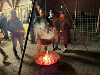 Zurück angekommen am Sportplatz konnte man sich wieder mit warmen und kalten Getränken aufwärmen. Das Feuerfass, sowie das Lagerfeuer, über dem die Gulaschsuppe köchelte, trugen ebenfalls zur wohlfühlenden Atmosphäre bei.