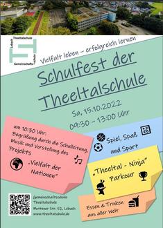 Schulfest an der Theeltalschule Lebach unter dem Motto „Vielfalt leben - erfolgreich lernen“ präsentiert sich die Schulgemeinschaft der Theeltalschule am Samstag, den 15.10.2022, in der Zeit von 9.30 bis 13 Uhr mit vielen kulinarischen Angeboten, Spiel- und Sportaktionen, Unterrichtsprojekten sowie kulturellen Darbietungen. Eine kleine zentrale Veranstaltung mit Rahmenprogramm findet um 10.30 Uhr statt. Zudem küren wir in einem Ninja-Parkour in unserer Sporthalle den diesjährigen Theeltal-Ninja und veranschaulichen in einer Projektpräsentation, wie es uns gelingt mit Kindern aus vielen verschiedenen Nationen erfolgreich zu lernen und die Schülerinnen und Schüler zu allen Abschlüssen inklusive dem Abitur zu führen. Wir freuen uns über viele Besucher die sich für uns, unsere Schulgemeinschaft und unser Schulkonzept interessieren!