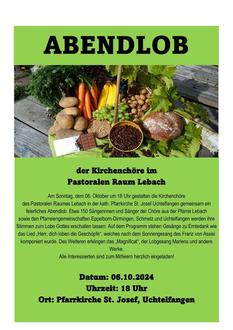 | 18:00 | Pfarrkirche | Uchtelfangen Abendlob zum Thema Erntedank, gestaltet von den Kirchenchören des pastoralen Raumes |