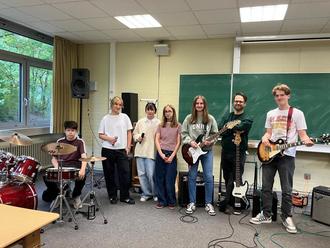 Seit einigen Jahren sorgt die Schülerband „Serious Seven“ für musikalische Highlights an unserer Schule und darüber hinaus. Unter der Leitung von Andreas Fischer treffen sich die jungen Musikerinnen und Musiker jeden Montag in der 7. und 8. Stunde zur Probe, um gemeinsam zu musizieren, neue Ideen auszuprobieren und ihren Sound weiterzuentwickeln. Zur Band gehören derzeit Nelea Martins, Josefine Wilbois und Luna Neumann (Gesang), Paul Haupenthal und Lara Scherer (Gitarre) sowie Bartholomäus Vogel (Schlagzeug).