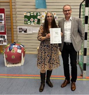 Zertifizierungsfeier Grundschule Reinsfeld: Frau Heike Meyer (Schulleiterin) & Herr Stefan Ding (Bürgermeister der Verbandsgemeinde Hermeskeil und Vorstandsmitglied des Naturparks)