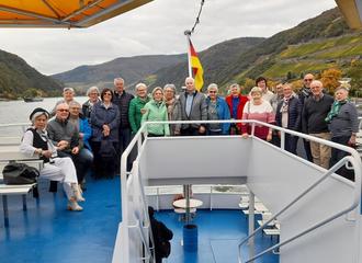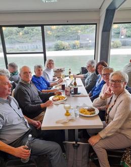 Jetzt konnte der Hauptteil des Programms starten und zwar die Loreley-Rundfahrt auf Deutschlands größtem Fluss. Von Bingen bis St. Goarshausen am berühmten Felsen mit der schönen Maid vorbei und wieder zurück an geschichtsträchtigen Burgen und Schlössern entlang. Bei Speis und Trank und viel Dommschwätzerei genoss man die entspannte Tour auf den Wellen von Vater Rhein. Nach etlichen Stunden endete diese Schifffahrt dort, wo sie begann, nämlich in Bingen.