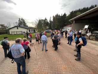 Anschließend ging es über den Hellenhausener Bann vorbei an der Vogelsbornkapelle und der Pfaffenhütte nach Mangelhausen auf die Dörr. Von hier aus hatten wir einen tollen Ausblick auf Wiesbach und die umliegende Landschaft. Bei schönem Wanderwetter und gut gelaunt spazierten wir dann den Großwaldweg hinauf zum Schwanenberger Hof. Dort erwartete uns bereits Landwirt Alois Ziegler, der uns seinen Hof und seine Arbeit vorstellte. Wir erfuhren so auch, was im Moment auf den Feldern ausgesät wird und wie sich die Situation der Landwirtschaft derzeit darstellt.