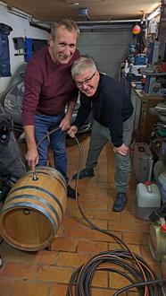 Jörg Hoffmann und Georg Jochem beim Wässern des neuen Eichenfässchens aus dem Eußenheim/Spessart. Das Fass wird jeweils eine Nacht mit kaltem und heißem Wasser gewässert bis es gefüllt wird.