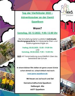 Am Samstag, 03.12.2022 findet ein ganz besonderer Tag der offenen Tür an der Gemeinschaftsschule Eppelborn statt. Von 9.00 Uhr bis 12.00 Uhr haben die 4. Klässler*innen, deren Geschwister und ihre Eltern die Möglichkeit in weihnachtlichem Ambiente, die Besonderheiten der GemS Eppelborn kennenzulernen und zu erfahren. Die Wichtel-Holzwerkstatt, Chemielabor, Physikexperimente, Englischunterricht für kleine Wichtel, Schulhausführungen, Ganztagsklassen, Elterncafé und vieles mehr erwarten euch und Sie an diesem besonderen Tag. Um 10.30 Uhr informiert die Schulleitung über die Besonderheiten und das Pädagogische Konzept der GemS Eppelborn.