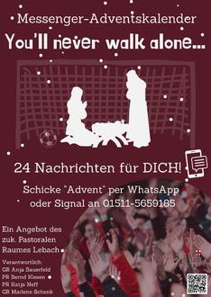 Unter dem Thema „You’ll never walk alone - Gemeinsam unterwegs“ schicken wir vom 1.-24.12.22 jeden Tag eine kurze Nachricht mit Gedankenanstößen und Impulsen.