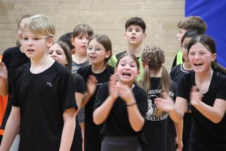 Die spätere Siegerklasse 5d jubelt nach einem gewonnenen Staffellauf.
