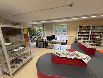 Ein kleinerer Teil der Schülerbibliothek des JKG mit Blick auf die Lesesofas und den Ausleihbereich