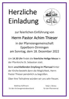 Herzliche Einladung zur feierlichen Einführung von Herrn Pastor Achim Thieser in der Pfarreiengemeinschaft Eppelborn-Dirmingen am Sonntag, 18. Dezember 2022.