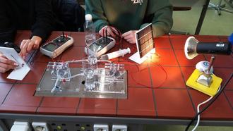 Mit großem Aufwand brachten dabei die Organisatoren die Schülerlabore von Uni und Schülerforschungszentrum in die naturwissenschaftlichen Praktikumsräume unserer Schule. Im Workshop „Wasserstoff als Energieträger“, der von Frau Deletz vom Schülerforschungszentrum Saarlouis betreut wurde, ging es um Elektrolyse und Brennstoffzelle. Im zweiten Workshop von Frau Schwan (einer ehemaligen JKGlerin!) und Herrn Martin des Schülerlabors EnerTec der Universität des Saarlandes, standen die erneuerbaren Energien im Vordergrund: Die Schülerinnen und Schüler konnten Messungen an Modellen von Windkraftanlagen und Solarmodulen durchführen. Im dritten Workshop von Herrn Nagel und Frau Mentes des Schülerlabors SinnTec der Universität des Saarlandes, ging es um „TeSiS“, die Technologie der Sensoren in Smartphones. In zahlreichen Experimenten an Steckboards konnten die verschiedenen Sensoren getestet werden und als besonderes Highlight wurde mit großer Begeisterung eine Platine mit einem elektronischen Würfelsimulator von den Schülerinnen und Schülern gelötet, die jeder mit nach Hause nehmen konnte.