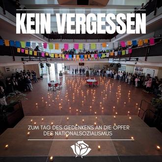 Organisiert von den Geschichtskursen und den Mitgliedern der AG Erinnerungskultur wurde der Opfer in einer Gedenkzeremonie im Atrium des Neubaus gedacht. Zahlreiche Kerzen, beschriftet mit Namen von Opfern des NS-Regimes, wurden symbolisch für die Millionen Opfer angezündet. Joshua und Paula aus der 12. Klasse lasen die Gedenkrede, bevor die Zeremonie mit einer Schweigeminute beendet wurde.