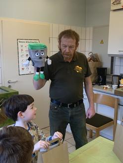 Er erklärte den Kindern, wie wichtig es ist, den Müll zu trennen und die Biotonne nur mit dem richtigen Biomaterial zu füttern.