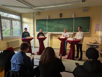 Am 15.02.2023 fand am GSG in Lebach in diesem Jahr der Regionalwettbewerb Jugend debattiert statt. Dabei geht es darum, dass jeweils vier junge Menschen in einer Weise, die jeden zu Wort kommen lässt, zu aktuellen Streitfragen der Gesellschaft argumentierend miteinander sprechen. So wurde beim diesjährigen Wettbewerb z. B. darüber debattiert, ob angesichts des Klimawandels eine Obergrenze für den täglichen Wasserverbrauch pro Kopf eingeführt werden soll, was ein Wasserverband in Brandenburg 2022 schon getan hat.