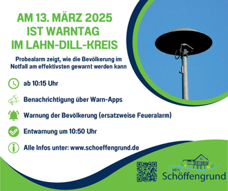 Der Warntag am 13. März beginnt um 10:15 Uhr mit der hessenweiten Warnung, sowohl über Cell-Broadcast, WarnApps (z.B. hessenWARN) als auch über die sich beteiligenden Rundfunkanstalten. Sofern in den Kommunen auslösbare Sirenen für die Warnung zur Verfügung stehen, erfolgt dabei auch ein Probealarm mit dem Sirenensignal „Warnung der Bevölkerung“. Um 10:50 Uhr erfolgt die Entwarnung.