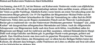 Am Samstag, dem 4.03.23, lud der Heimat- und Kulturverein Niederwetz wieder zum alljährlichen Schlachtfest ein. Obwohl das Fest pandemiebedingt mehrere Jahre ausfallen musste, erfreute sich der Verein an großer Nachfrage. Sämtliche Karten waren bereits am ersten Vorverkaufstag unter die interessierten Bürger gebracht. Um 19 Uhr begrüßten der Bürgermeister Michael Peller und der Vereinsvorsitzende Norbert Gelzenleuchter die Gäste der Veranstaltung im vollen Saal des DGH Niederwetz. Neben dem aus der Region stammenden Fleisch und der Wurst der Landmetzgerei Becker gab es traditionell die von den Niederwetzer Obstbäumen geernteten “Soisäppel” und „dicke Kuchen“ mit dazugereichten selbstgemachten Marmeladen und Gelees. Auch die obligatorische Schnapsrunde vom Bürgermeister durfte nach dem Essen nicht fehlen. Anschließend saßen die Bürgerinnen und Bürger noch bei Apfelwein und Bier zusammen, während Heimatdichterin Margit Diehl noch einige Gedichte zum Besten gab. In geselliger Runde wurde gesungen, gefeiert und gelacht. Zum Abschluss konnte man dann noch ein gepacktes Wurstpaket erwerben. Der Vorstand bedankt sich bei allen Gästen, den Ehrengästen und vor allem bei den fleißigen Helfern hinter den Kulissen, die allesamt dazu beitragen, solche Traditionen am Leben zu erhalten und freut sich schon auf das Schlachtfest im nächsten Jahr.