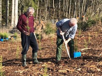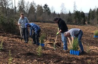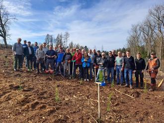 Schöffengrund - Wen sie mal nicht am Singen sind, dann pflanzen sie auch schon mal ein paar Bäume. - In Zusammenarbeit mit dem Forstbetrieb Zimmermann aus Niederquembach und der neuen Revierförsterin Catrin Rahn, von Hessen Forst hat die Chorgemeinschaft Quembachtal am 18. März dieses Jahres zu einer Pflanzaktion aufgerufen. Der Einladung folgten insgesamt 26 freiwillige Helfer.