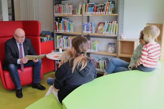 Landrat Wolfgang Schuster las den Kindern in der Gemeindebibliothek Hüttenberg aus dem Buch vor, das dieses Jahr Teil des Lesestart-Sets ist.