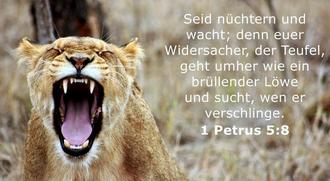 Seid besonnen, seid wachsam! Euer Feind, der Teufel, streift umher wie brüllender Löwe, immer auf der Suche nach einem "Opfer", das er verschlingen kann. Widersteht ihm, indem ihr unbeirrt am Glauben festhaltet;...