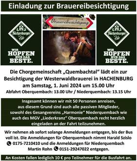 Die Chorgemeinschaft „Quembachtal“ lädt ein zur Besichtigung der Westerwaldbrauerei in HACHENBURG am