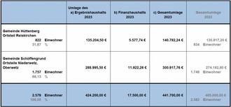 Die vorläufige Umlageberechnung für das Haushaltsjahr 2023 wurde ermittelt auf der Grundlage der Einwohnerzahlen zum 30. Juni 2022 und wird wie folgt festgesetzt: