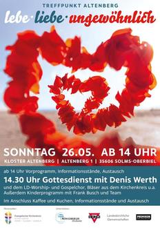 | Ab 14.00 Uhr | Treffpunkt Altenberg; lebe-liebe-ungewöhnlich Gottesdienst, Informationsstände, Austausch, Kinderprogramm, Kaffee und Kuchen |