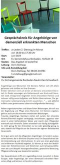 | 16.00 Uhr | Gesprächskreis „Demenz“ in Bonbaden, ev. Gemeindehaus |