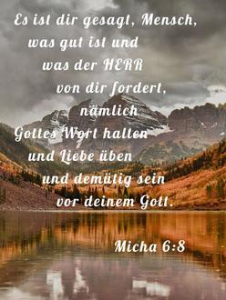 Nein! Der Herr hat euch doch längst gesagt, was gut ist! Er fordert von euch Menschen nur eines:"Haltet euch an das Recht, begegnet anderen mit Güte, und lebt in Ehrfurchtvor eurem Gott!"