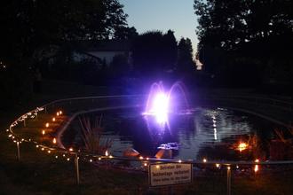 Bei Getränken und Gegrilltem, in fröhlicher Runde, genießen wir bei einbrechender Dämmerung die Beleuchtung der Teichanlage mit Fackeln, Schwimmkerzen und Lichterketten.