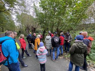 Vorstandsmitglied Bodo Desch freute sich in der Begrüßung, den letzten freien Termin in diesem Hebst bekommen zu haben. Die 20 Teilnehmer konnten sehr viel Neues über Eigenschaften und Unterscheidungsmerkmale der essbaren und ungenießbaren Arten erfahren. Unser tägliches Brot, aber auch Bier und Wein, würde es ohne Pilze nicht geben, die eine der ältesten Lebensformen auf unserer Erde darstellen. Allein in Deutschland sind etwa 14000 verschiedene Arten nachgewiesen, von denen nur einige am Wegesrand gefunden wurden. Stockschwämmchen am Fuß einer alten Kopfweide, Milchlinge oder Reizker, verschiedene Knollenblätterpilze im Vergleich zu Champignons wurden gezeigt und besprochen, ebenso wie Stäublinge (Boviste) und der Graue Faltentintling, der nicht in Verbindung mit Alkohol genossen werden darf. Eine kleine Sensation war der Fund des Langstieligen Schleimschirmling (Limacella furnacea), der damit erst zum siebten Mal im gesamten Bundesgebiet nachgewiesen wurde. „So etwas erfreut das Expertenherz. Der wuchs einfach so auf einem Misthaufen“. Wesentlich mehr Pilze konnten dann im Wald gefunden und bestimmt werden. Viele Arten leben in Symbiose mit Bäumen, so auch der Birkenporling, dem heilende Wirkung zugeschrieben wird. Der Hallimasch ist ein Vertreter der Holz zersetzenden Arten. Pfifferling, Steinpilz, Braunkappe und Krause Glucke sind ebenfalls lecker. „Es gibt natürlich viel mehr Esspilze, aber man sollte lieber bei denen bleiben, die man gut kennt“. Eine weitere Besonderheit wurde im Laub entdeckt: Der Tintenfischpilz (Clathrus archeri), mit seinen grell-roten Krakenarmen aus einem gallertartigen Hexenei wachsend, ist eine invasive Art. Doch ganz so selten ist er nicht, schon 1914 in den Vogesen wurde er kartiert und ist in guter Ausbreitung begriffen. Mit der Stinkmorchel verwandt, liebt der Neuseeländer „warme und feuchte Habitate“ (Quelle Wikipedia). Der Klimawandel lässt grüßen. So wurde der trübe Sonntagnachmittag zu einem interessanten und spannenden dreistündigen Ausflug in die mystische Welt der Myzel-Organismen.
