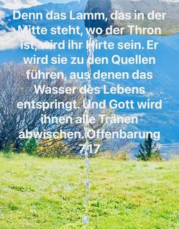 Denn das Lamm, das in der Mitte steht, wo der Thron ist, wird ihr Hirte sein. Er wird sie zu den Quellen führen, aus denen das Wasser des Lebens entspringt. Und Gott wird Ihnen alle Tränen abwischen.