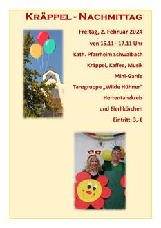 | 15.11 Uhr | Kräppelkaffee im Pfarrheim Schwalbach |