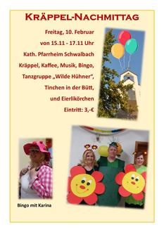 | 15.11 Uhr | Kräppelnachmittag, Eintritt 3€, Schwalbach (Pfarrheim) |