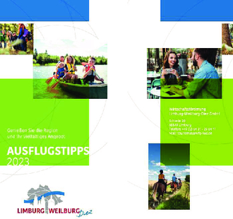 Die beliebte Broschüre „AUSFLUGSTIPPS“ ist seit Mitte Februar in einer neuen, überarbeiteten Auflage für das Jahr 2023 erschienen. Sie präsentiert sich dabei wie gewohnt im praktischen Taschenformat, wurde aber in ihrer neuen Auflage um zahlreiche Inhalte ergänzt. Auf insgesamt 104 Seiten bündelt die Broschüre dabei weiterhin das kreisweite Freizeit- und Kulturangebot in der Region Limburg-Weilburg übersichtlich und auf einen Blick. Die durch die Wirtschaftsförderung Limburg-Weilburg-Diez (WFG) gemeinsam mit den Städten und Gemeinden des Landkreises entwickelte Broschüre bietet seit Jahren eine erste Orientierung für Tages- und Wochenendbesucherinnen und -besucher, Urlauberinnen und Urlauber sowie Geschäftsreisende und nicht zuletzt für die Bürgerinnen und Bürger des Landkreises.